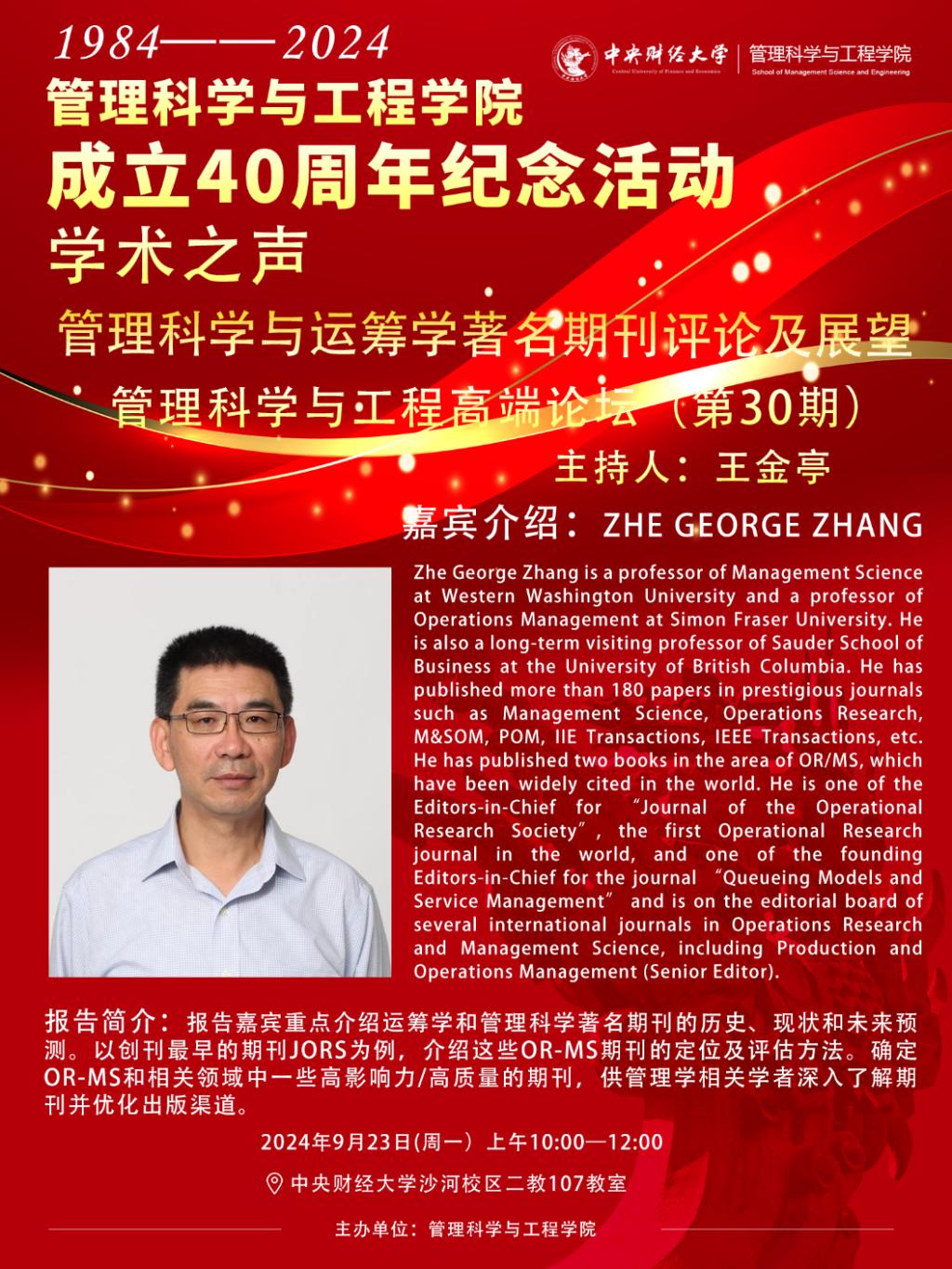 2024年9月23日上午,应beet365邀请,美国西华盛顿大学的Zhe George Zhang(张喆)教授来访并做管理科学与工程高端论坛讲座。本讲座在沙河校区二教107教室举行,由王金亭教授主持。张喆教授重点介绍了管理科学与运筹学著名期刊及未来展望,beet365吴迪老师以及部分博士研究生、硕士研究生积极参加了本次高端论坛讲座。这次高端论坛讲座也是庆祝beet365成立四十周年学术之声的一场国际学术交流活动。