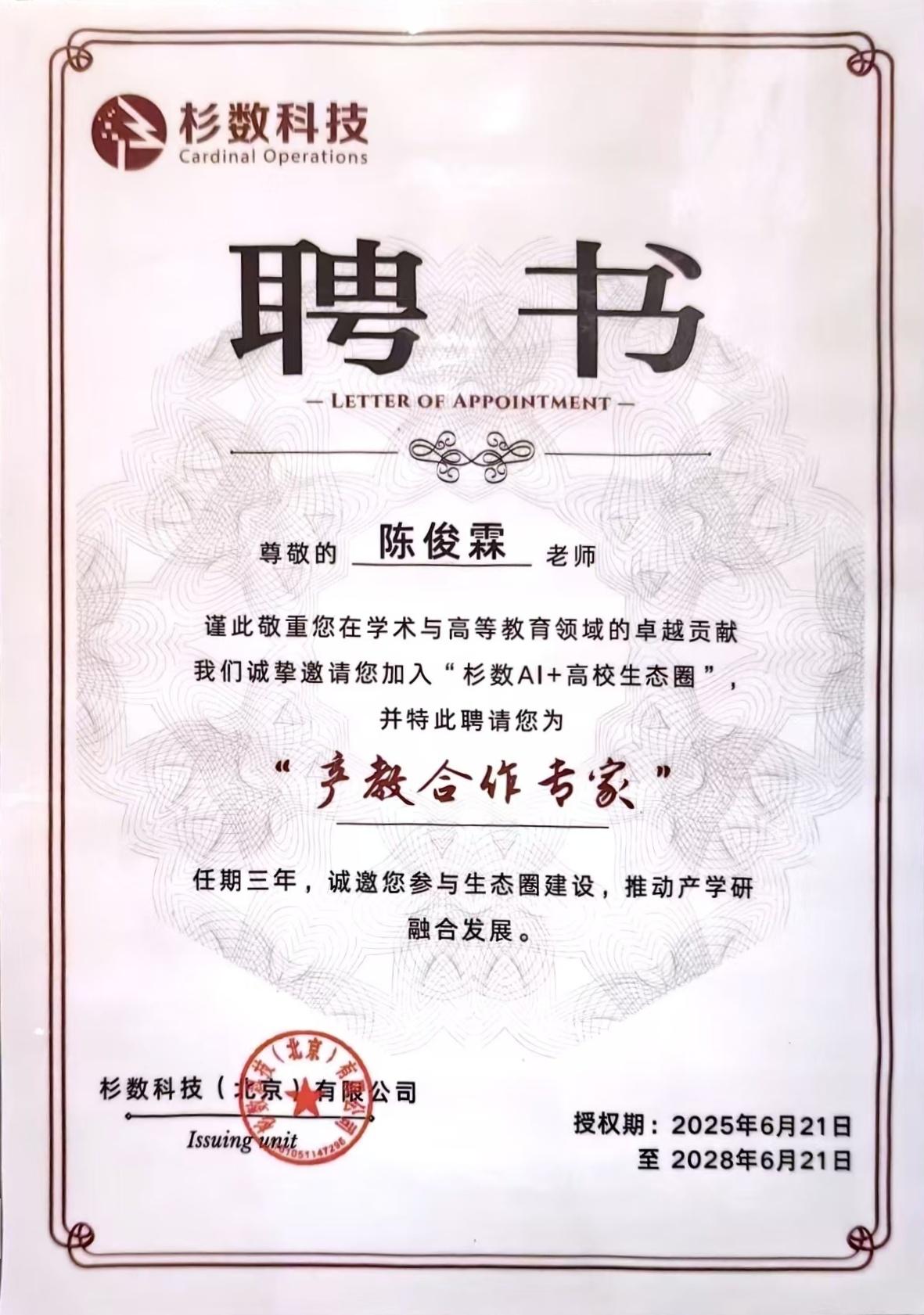 2025年6月21日,在杉数科技主办的“AI赋能高校智能决策教学沙龙——北京站”活动中,beet365的陈俊霖教授受聘为杉数科技的产教合作专家,聘期为三年,此次合作为公司学科发展注入了新的动力。