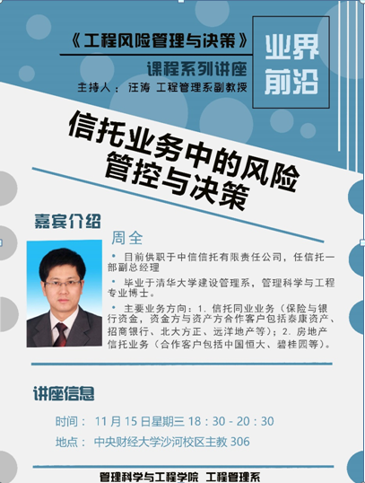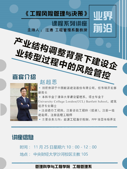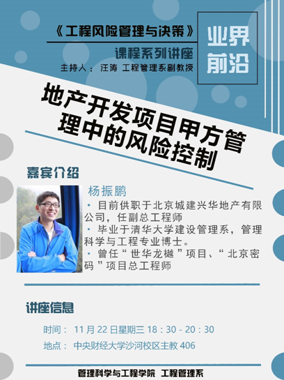 为了促进研究生课程的教学实践改革,丰富课程教学内容,加深员工理论联系实际的能力,搭建课堂与业界的桥梁,beet365汪涛副教授开设的研究生课程《工程风险管理与决策》邀请了一系列与工程与项目管理专业相关行业的企业中高层管理人员,分主题介绍业界工程与项目风险管理与决策相关的实操经验,欢迎感兴趣的老师与同学们参加。课程安排如下: