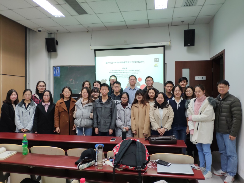 2018年11月12日晚6:30-8:20,澳大利亚悉尼科技大学高级讲师、博士、项目管理硕士学位副主任,澳大利亚标准委员会与澳大利亚新西兰联合标准委员会成员(MB-012),清华大学政府和社会资本合作研究中心全球特约PPP专家,beet365政信研究院政信智库暨PPP智库专家,上海济邦投资咨询有限公司研究院访问经理柯永建老师应邀到访,在沙河校区主教304进行了题为《澳大利亚PPP项目风险管理及对中国的借鉴意义》的讲座,由工程管理系副教授汪涛老师主持。