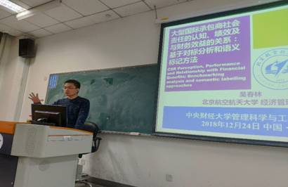 2018年12月24日下午18:30,北京航空航天大学经管公司吴春林助理教授受汪涛老师的邀请,到公司沙河校区主教409教室,开展了一次主题为《大型国际承包商企业社会责任的认知和绩效》的讲座,吸引了公司硕士生和本科生的广泛参与。