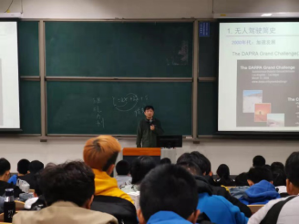 其中,无人驾驶的感知首先包含了定位与导航,即通过卫星系统确定车辆所处的位置,同时通过算法计算得到前往目的地的最佳路线。感知还包含了识别与认知。识别是通过传感器、摄像头等端口采集大量的道路信息,并通过这些信息准确识别物体与路况。针对识别与认知,李老师为同学们介绍了大量的相关研究与案例;在识别与认知的基础上,通过人工智能算法,进行精准有效地道路规划与行车决策,而控制设计也是无人驾驶技术的重要组成部分。