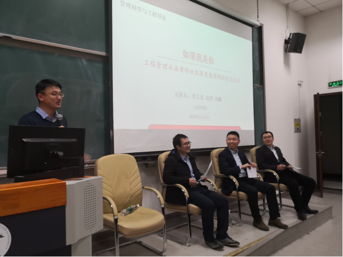 2019年12月10日晚上7:20-9:30,住建部计财与外事司经济信息处副处长倪稞先生,中国电建国际公司战略与经营管理部总经理任超锋先生,中国建筑股份有限公司金融部资深高级经理曲鸣先生受公司工程管理系教师邀请,在沙河主教212与管理科学与工程2019级全体同学开展精彩对话,活动由李玉龙老师主持。
