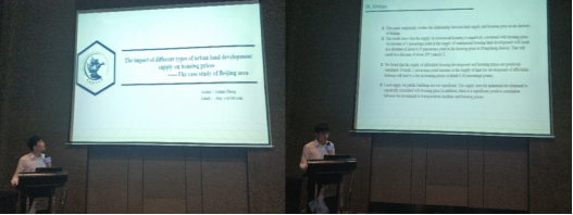 在随后的交流中,郑伊硕同学受邀作为Land Supply会场的论文讨论人,对清华大学Shuping Wu博士的参会文章《Strategic Bidding in Two-stage Land Auction in China》。进行了简单评论,对论文中的竞价主体的异质性方面的问题提出了相关研究观点,与在场学者展开了讨论,郑伊硕同学的讨论得到了论文作者的积极响应,并就此问题展开了深入交流。