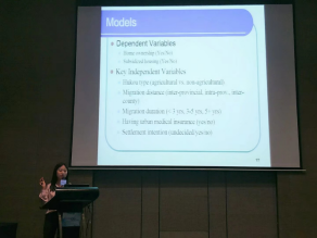 在随后的报告中,雷鸣同学受邀成为Housing Policy主题会场报告论文《Ecological Immigration, Multidimensional Poverty and Spatial Reconstruction —— Taking Liupanshan Minority Agglomeration Area in Ningxia as an Example》的评论人,雷鸣同学就文章写作出发,指出文章对宁夏六盘山的多维贫困问题,提出了新的测算指标,结合GIS等空间分析软件和相关空间分析方法,就六盘山的多维贫困演变过程进行了研究。同时,雷鸣同学指出文章对生态移民,多维贫困以及空间重构的逻辑框架值得进一步讨论。随后就多维贫困的测算指标选择进行了点评。同时提出了对多维贫困,生态移民的内涵与中国现状理解,并就其中的研究关系进行了评论。雷鸣同学的评论得到了在场主持人和论文作者的认同,并以此展开了讨论与交流。