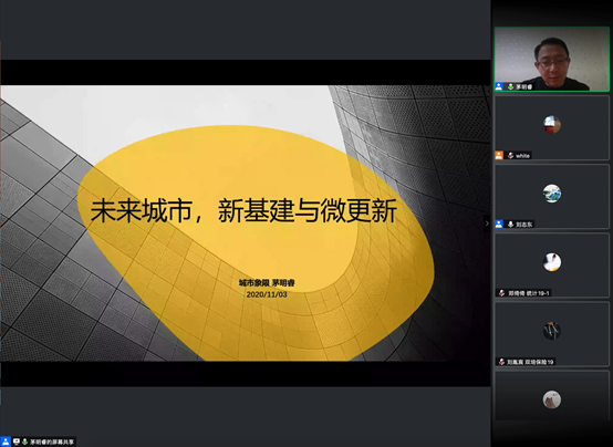 2020年11月3日,由beet365主办,beet365经理刘志东老师主持,影响未来经济的新科技与新产业系列讲座邀请了北京城市象限科技有限公司创始人、CEO,北京社区研究中心主任茅明睿老师,以《未来城市,新基建与微更新》为题,在线上为同学们带来了一场生动的讲座。茅明睿老师曾长期担任北京市城市规划设计研究院规划信息中心副主任、云平台创新中心秘书长。现担任有北京城市实验室(Beijing City Lab)执行主任,住建部科学技术委员会人居环境专委会委员和社区建设专委会委员、全国自然资源与国土空间规划标准化技术委员会国土空间规划分技术委委员、中国城市科学研究会城市大数据专业委员会副秘书长等多项社会职务、学术职务。