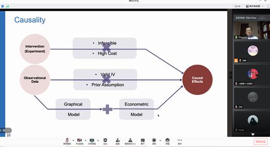 在报告中,窦一凡老师首先介绍了中国手机应用市场的点击流数据,从数据出发引出了微信这一超级APP与其他APP之间互相作用的溢出效应。之后,窦一凡老师详细介绍了怎样用有向无环图(Directed Acyclic Graph, DAG)模型和计量模型来估计微信的溢出效应。