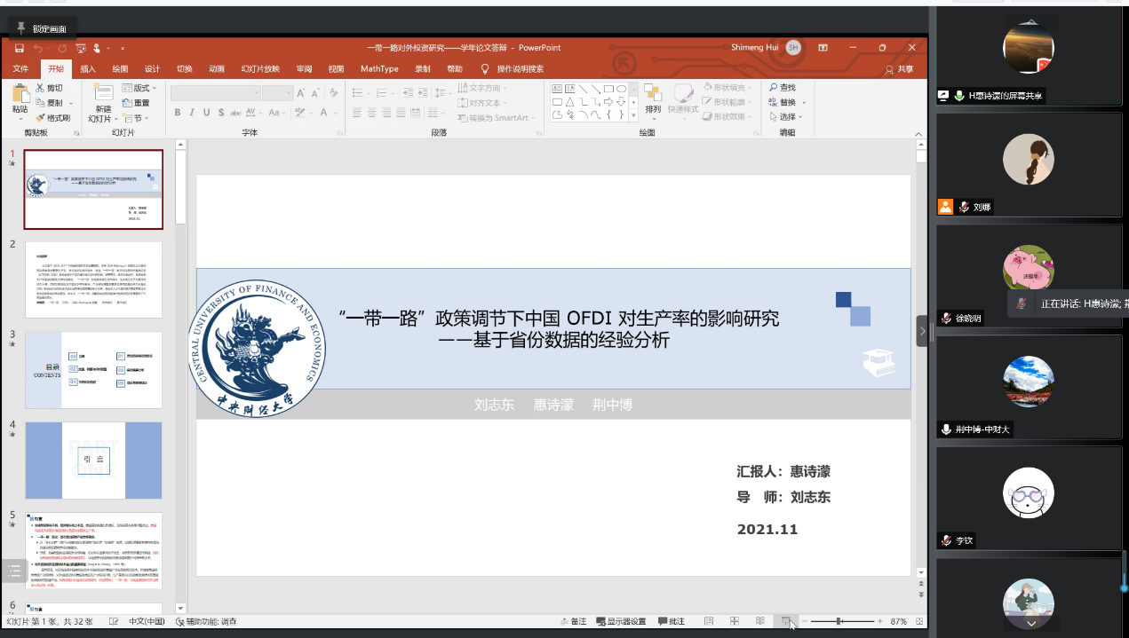2018级博士生惠诗濛以“‘一带一路’政策调节下中国OFDI对生产率的影响研究——基于省份数据的经验分析”为主题进行了报告。她采用DEA-Malmquist指数及其分解刻画了我国省级全要素生产率、技术效率和技术进步,并检验“一带一路”政策对我国对外直接投资影响省级生产率的调节效应及作用机制。王志锋教授根据论文具体内容,指出了论文目前存在的问题,并提出了关于文献综述引用、省份差异性研究、论文题目等方面的修改建议。