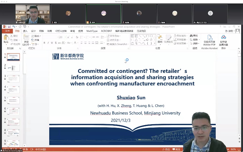 12月3日19时,闽江公司新华都商公司副教授孙淑晓博士应邀通过腾讯会议为公司师生开展了一场题为Committed or contingent? The retailer’s information acquisition and sharing strategies when confronting manufacturer encroachment的学术讲座。本次讲座由公司助理教授刘赫主持,管理科学系副教授井帅以及来自本院各专业本科生和硕士研究生参加本次讲座。