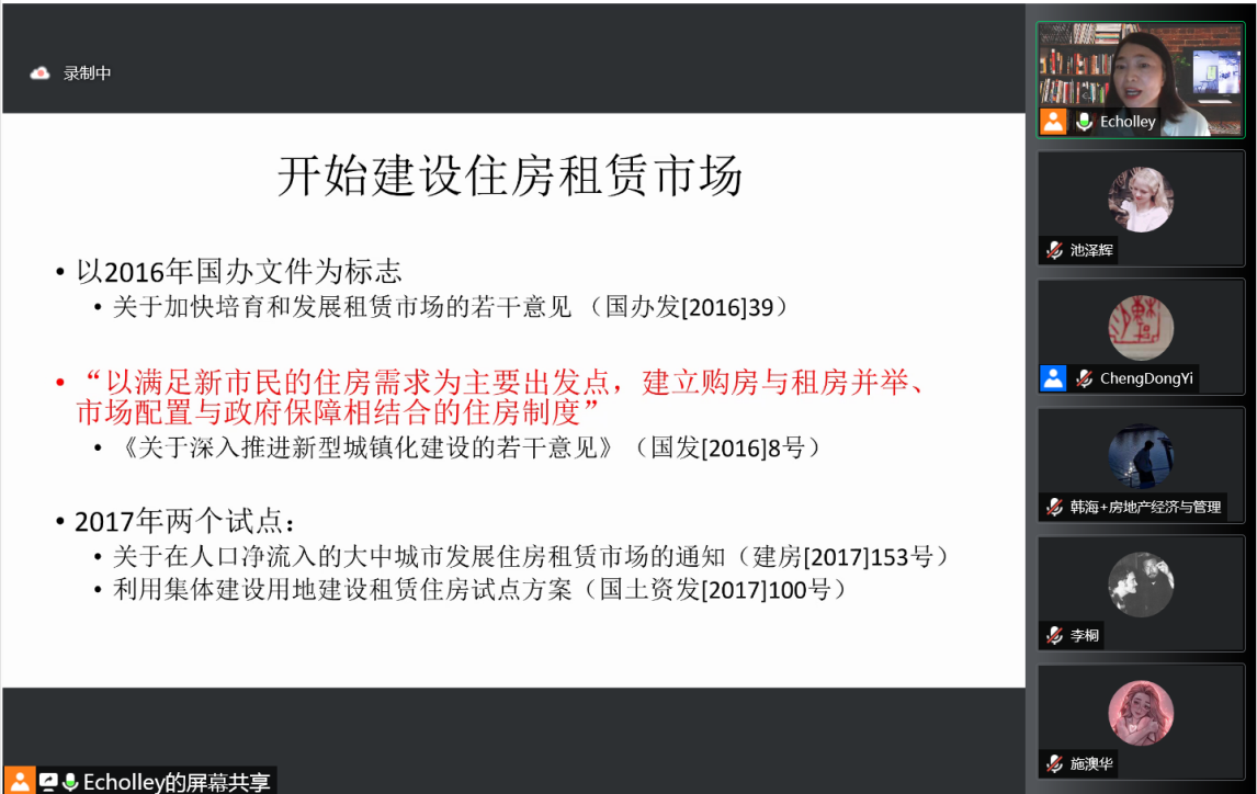 此次讲座由公司易成栋教授作为主持人,公司部分投资学专业博士研究生、全体房地产经济与管理专业硕士研究生共同参与。马教授围绕我国的住房租赁制度发展问题进行了深入的分析与讲解,整个讲座主要介绍租赁住房制度在我国发展的历程:伴随着租购并举制度的开展,我国逐渐从以售为主向买房和租房并举的方向发展。先后进行了公租房、市场租赁房以及保障性租赁住房制度的发展和完善,并最终形成了一个公租房-市场租赁-保障性租赁的三分的住房租赁体系。改革开放以来,我国建立了以售为主的住房体系,随着1998年住房分配货币化的实行,福利分房制度终结,住房租赁的市场化机制初步确立。廉租房在住房保障体系中被首次提出。2010年我国建立公租房制度,公租房逐渐取代经济适用房成为保障性住房的供应主体。自此我国租赁住房市场的“二元”格局形成并持续至今:即以廉租房和公租房为主体的保障性租赁住房市场和完全商品化的住房租赁市场,同时经济适用房和限价房转变为共有产权房。但公租房主要为了解决城镇收入与住房双困家庭的住房问题,由于准入条件对于本地人和外地人有所差异,外来人口住房问题并没有解决。2016年我国开始建设住房租赁市场,要求“以满足新市民的住房需求为出发点,建立购房与租房并举、市场配置与政府保障相结合的住房制度。市场租赁自2017年试点启动后快速发展。2021年6月国务院发布了关于加快发展保障性租赁住房的意见,自此我国形成了一个公租房-市场租赁-保障性租赁的三分的住房租赁体系。