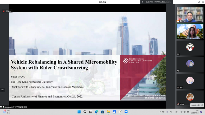 2022年10月27日(周四)上午10:00—11:30,公司邀请到香港理工大学汪玉兰教授开展了题为“Vehicle Rebalancing in a Shared Micromobility System with Rider Crowdsourcing”的线上学术交流讲座。讲座由beet365副经理王金亭教授主持,参加讲座的听众来自中国科学技术大学、复旦大学、上海交通大学、天津大学、燕山大学等高校的师生,beet365多位老师、研究生、本科生参加了此次讲座。