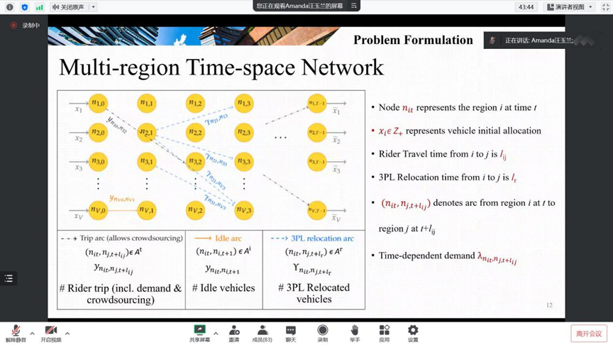 在本次讲座中,汪玉兰教授首先以生活中观察到共享单车的周期性现象引入,比较“Shared Mobility”和“Shared Micromobility”两个概念的区别,提出共享出行中需要解决的问题以及研究中使用的解决方法。在实际运营中,考虑到为了满足需求,共享单车需要再重新分配,对应有两种策略——第三方物流(3PLs)和众包骑手(Crowdsourcing riders)。其中第三方物流是一次性大量运输,每辆车的成本较低,时间安排是确定的;众包对应一人一车,重新分配每辆共享单车的成本较高,但时间安排灵活。