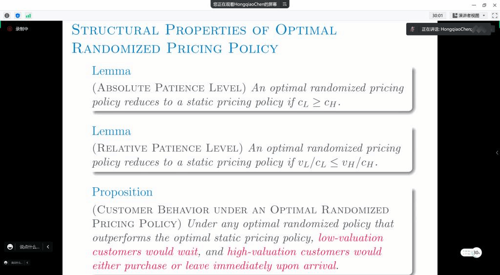 本次讲座中,陈虹桥博士首先构建了跨期价格歧视模型,建立优化的目标函数后并求解,得出最优定价分布属于两点分布,并将最优价格分布描述为随机促销策略,高支付意愿顾客在到达时将立即以正常价格购买,而低支付意愿顾客将等待随机促销。接着,陈博士给出了所有确定性定价策略的策略空间内的最优策略是周期性定价策略并将其与最优随机定价策略进行比较,得出在低支付意愿顾客足够耐心且高、低支付意愿顾客的绝对差异足够大的情况下,最优随机定价策略优于统一定价策略。