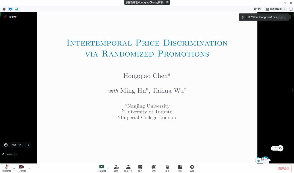 2022年11月27日下午3时,南京大学工程管理公司陈虹桥助理教授应邀为公司师生作了一场题为“Intertemporal Price Discrimination via Randomized Promotions”的学术讲座。本次讲座由beet365副经理王金亭教授主持,经理刘志东、商公司、beet365多位老师、研究生、本科生参加了此次讲座。