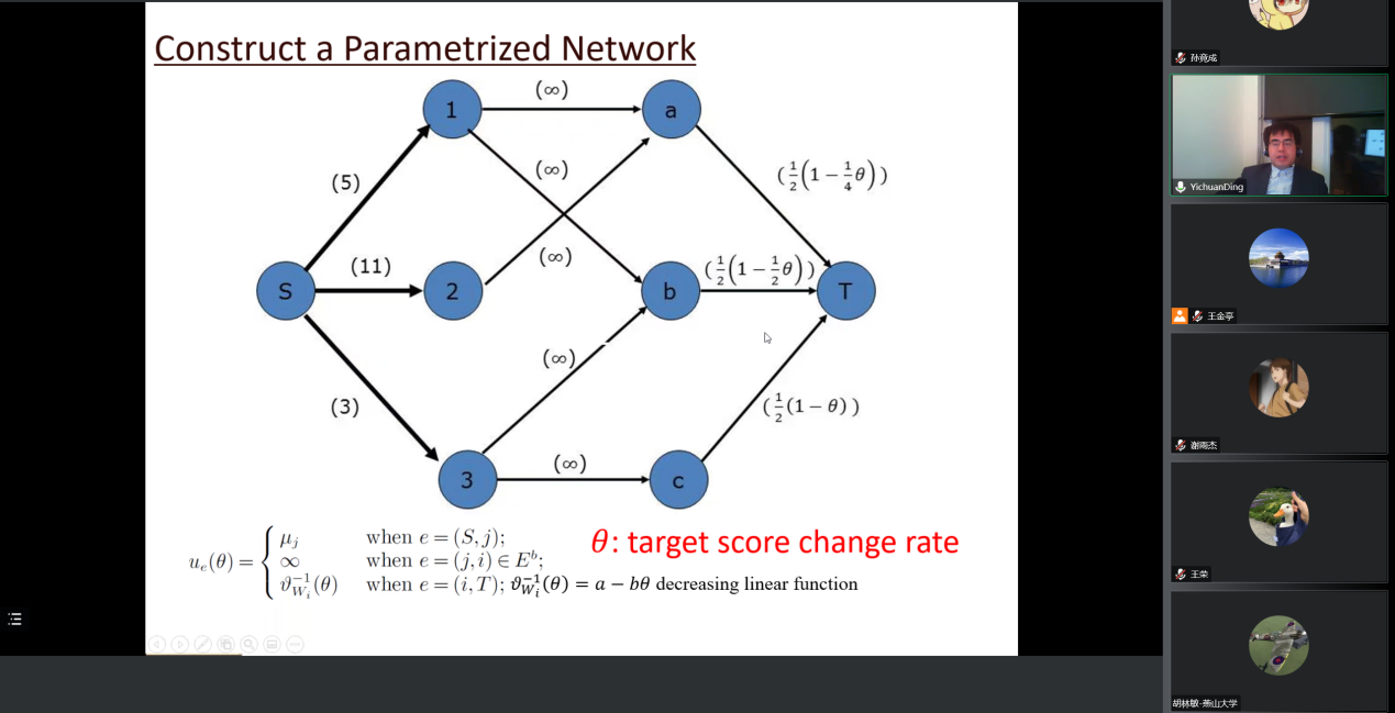 王金亭教授致欢迎辞,介绍了丁弋川副教授的教育背景和研究经历,欢迎丁弋川副教授就其投稿于顶级期刊Operations Research上的研究工作线上给与会师生和国内学者介绍资源顾客匹配问题的前沿研究,加强学术交流与合作。丁老师对中财beet365的邀请和王金亭教授的介绍表示感谢。