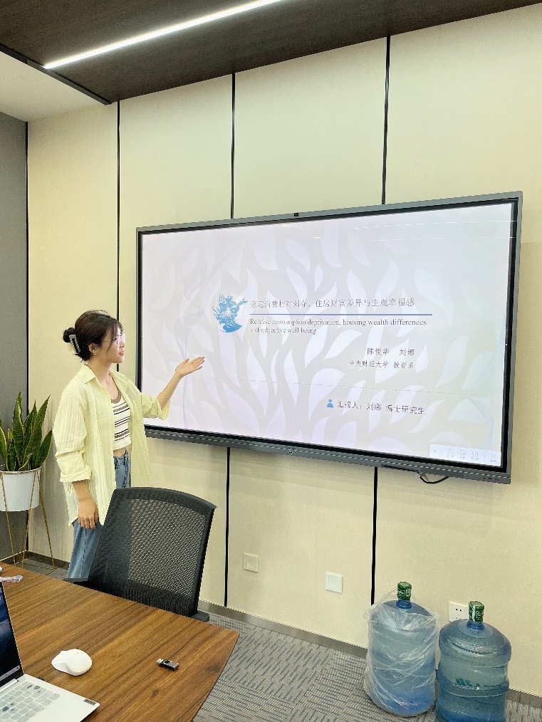 刘娜在GCREC分会场报告论文“家庭消费相对剥夺、住房财富差异与主观幸福感”,与参会学者分享了由消费相对剥夺所引起的居民主观幸福感变动。该论文利用2019年中国家庭金融调查(CHFS)数据,度量了家庭消费相对剥夺程度,估计了家庭总量消费相对剥夺、生存型与发展型消费相对剥夺对主观幸福感的影响,并回答了该边际影响是否会随着家庭住房财富的变化而呈现异质性这一重要问题。研究从消费与住房双重角度为消除中国当前社会矛盾、增进民生福祉提供了政策启示。
