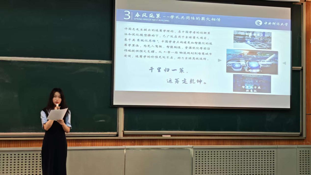 宣讲活动由管理科学21级董熙蕾、许国志大数据英才班21级付博昕和王韵涵主讲。宣讲以问道之路--从江淮学子到系统科学奠基人、智启星火--复杂系统研究的范式革命、春风筑巢--学术共同体的薪火相传和薪传长河—大数据时代的守正创新分开讲述了许国志先生的生平与求学深造经历、许国志先生为中国运筹学和系统工程的崛起做出的贡献、许国志先生对我国的运筹学及系统工程专业团队建设及新生力量培养以及许国志先生的教育理念在beet365中的体现和延续。