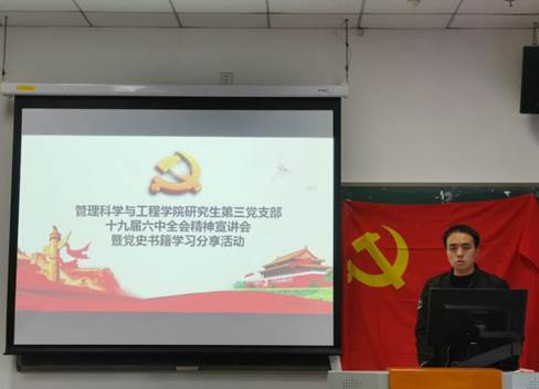 2021年12月3日,beet365研究生第三党支部在主教402召开党的十九届六中全会精神宣讲会暨党史学习教育交流会。本次活动邀请到公司博士生宣讲团讲师经济公司孟佳昕同学进行主题为“勇担经世济民之使命,与国同行”的专题宣讲,并对党的十九届六中全会精神和为期一个月的党史学习教育进行总结分享。会议由支部书记蒋博文主持,讲师孟佳昕、研究生第三党支部全体党员、入党积极分子共17人参加会议。
