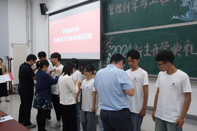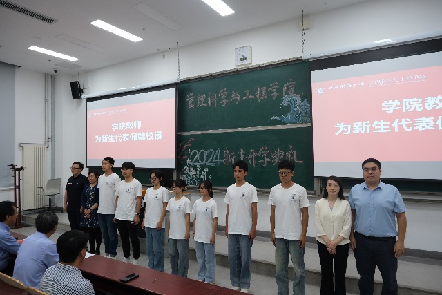 公司教师为本科生、研究生新生代表佩戴校徽,寄托着老师们对2024级全体新生不畏艰险、砥砺前行、勇立潮头的期盼,激励着每一位新生将“忠诚、团结、求实、创新”的校训内化于心、外化于行。