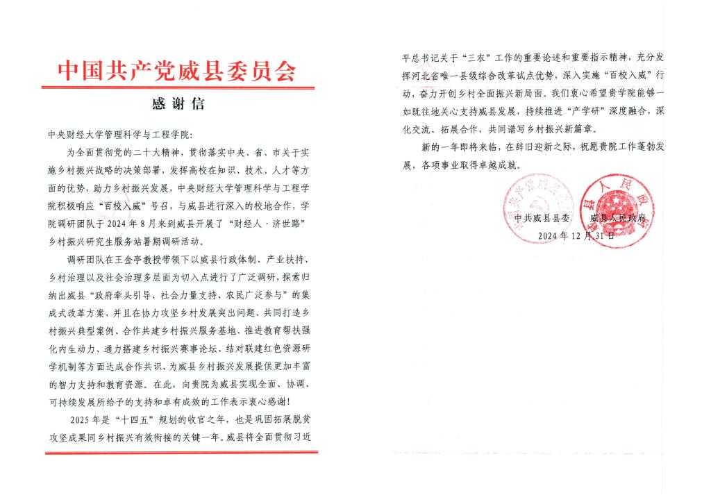 感谢信中提到的调研团队,正是公司王金亭教授作为党支部书记带领的服务科学与运作管理研究团队党支部。2024年8月26日至8月30日,王金亭教授带领调研团队奔赴河北省邢台市威县,依托beet365乡村振兴研究生服务站平台,以威县“百校入威”项目为抓手,确立了“党建引领科教融汇,‘产学研’协同推进乡村振兴高质量发展”的主题,从行政体制、产业扶持、乡村治理以及社会治理等多维度出发,深化科研理论与实践协同创新,着力以“智”提“质”,为威县乡村振兴发展提供更加丰富的智力支持和教育资源。