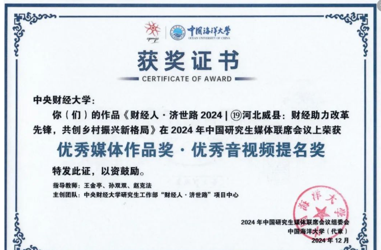 该团队的调研成果《财经人·济世路2024 | ⑲河北威县:财经助力改革先锋,共创乡村振兴新格局》在2024年中国研究生媒体联席会议上获“优秀媒体作品奖·优秀音视频提名奖”。推文梳理了调研从合作站签约授权到调研主题确定再到调研开展的全过程,最终挖掘出威县改革的系统集成观念和具体举措,总结威县当前的“以行政支持产业,基于产业发展帮扶农民,并基于群众意见反馈调整行政体制改革”的闭环政策,凝练威县“系统集成式”综合改革创新模式。