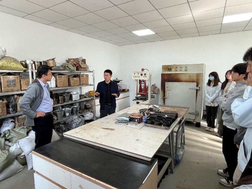 随后,文教授带领师生参观了公司实验基地,并介绍其参与公路工程技术和材料研发的历程。从沥青技术相关工艺到 “中国沥青路面五朵金花” 的传奇故事,那些在技术攻坚中绽放的女性力量,成为行业精神的生动注脚。他借此教导同学们,在科研的道路上,不分性别,不分先后,坚信“精诚所至,金石为开”,对事业的责任与热爱,是推动行业进步的核心动力。