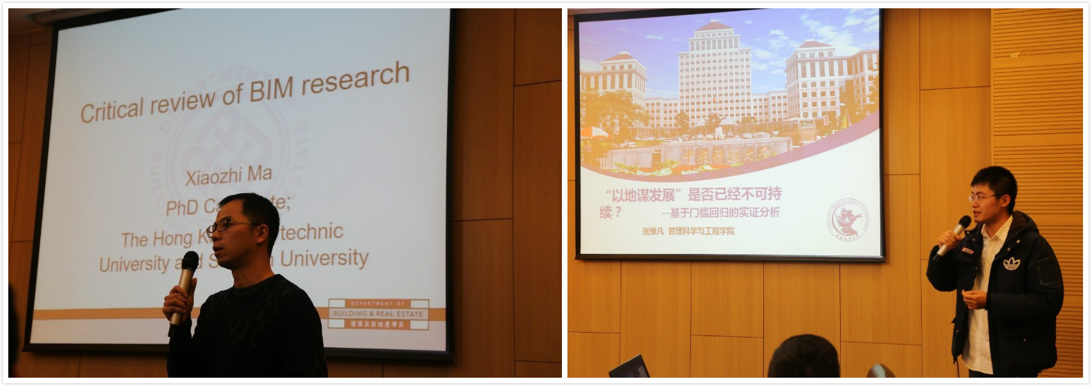 随后则是来自香港理工大学的马骁智发表了主题为“Introduction of HKPOLYU CIBSC & Critical Review of BIM Research”的汇报,详细回顾了建筑信息模型(BuildingInformationModeling,BIM)相关研究并进行分类和文献计量,说明了相关研究主要内容和发展方向。最后则是来自beet365投资系博士生张维凡发表了主题为“以地谋发展”是否已经不可持续?——基于门槛回归的实证分析”的汇报演讲,首先他介绍了由于我国特殊国情导致的政府“以地谋发展”的基本情况,并基于2008-2015年265个地级市面板数据,采用门槛回归模型实证检验了地方政府“以地谋发展”的发展模式是否还可持续问题。最后得到“以地谋发展”模式已经不可持续,不可持续的原因在东部与中西部地区不同的最终结论。