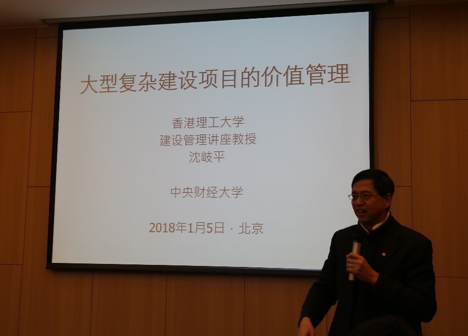 接下来,香港理工大学沈岐平教授进行了题为“大型复杂建设项目价值管理的科研及实践”的精彩演讲。沈教授声情并茂地向在座各位师生介绍了香港理工大学基本情况,并通过幽默风趣的语言其有关价值管理的科研成果及实践。沈教授阐述了价值管理在政府投资项目中应用的重要性。同时,他还介绍了“苏格兰议会大楼项目超支9倍”、“香港某大型污水处理厂搬迁”等项目,深入浅出地论证了在政府投资的大型复杂的公共项目中,除了要应用价值管理的方法,缕清不同的利益相关者的利益诉求也至关重要的观点。沈岐平教授深厚的理论功底和风趣的演讲方式赢得了全场师生的阵阵掌声,从“埃及金字塔的故事”到“香港大屿山山地自行车路径的设计”,从学术研究到生活实践,沈教授将价值管理应用的淋漓尽致。