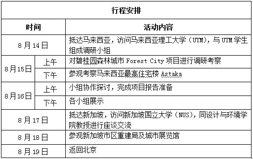 本次出访交流具体行程内容如下:第一天,由王昊老师带领十名本科生从北京乘机出发,于早八点抵达马来西亚理工大学(UTM),由马来西亚理工大学教职员带领参观大公司园环境,感受马来西亚大公司园氛围,随后与UTM的三名员工组成员工调研小组,进行自我介绍与初步了解,并做好项目实地考察准备工作;第二天团队前往当地基础设施建设项目进行考察调研,上午前往碧桂园在马来西亚的森林城市项目,同项目负责人深入访谈,了解项目相关情况,下午赴马来西亚新山市中心的Astaka马来西亚最高住宅楼进行参观调研;第三天,调研小组进行讨论,小组成员共同协作完成调研报告并做展示,由马来西亚教职员及王昊老师进行点评;第四天,由马来西亚新山前往新加坡国立大学(NUS)访问考察,与该校设计与环境公司师生围绕新加坡公用房问题进行座谈交流;第五天,前往参观新加坡市区重建局及城市展览馆,了解新加坡的城市规划及整体规划理念;第六天,由新加坡乘机返京,学习考察之旅结束。