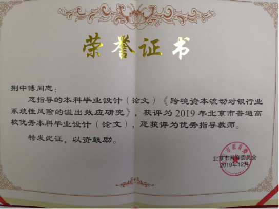 在北京市教委组织开展的2019年北京市普通本科高校老员工毕业论文(设计)评选中,投资系2019届毕业生李雪萌同学撰写的毕业论文《跨境资本流动对银行业系统性风险的溢出效应研究》获评北京市普通高校优秀本科毕业论文。李雪萌同学的指导教师荆中博副教授被北京市教育委员会评选为“优秀指导老师”。