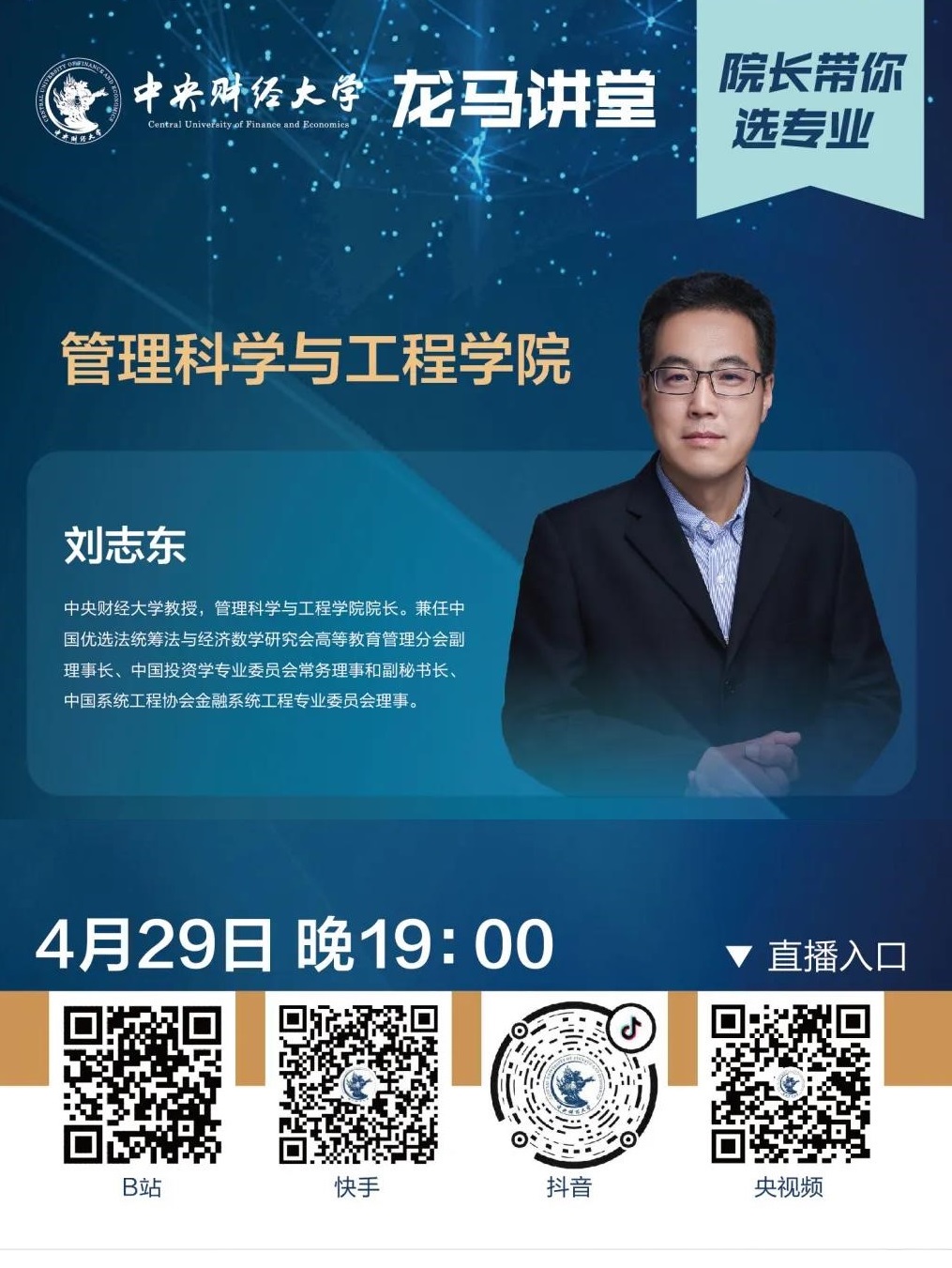 4月29日晚,经理刘志东做客公司本科招生办主办的“龙马讲堂”——“经理带你选专业”栏目,面向全国2020年高考考生和家长作专题讲座,题为“开启大数据与智能时代管理世界大门的金钥匙”。该栏目以在线方式,通过beet365官方B站直播间面向广大考生播出。