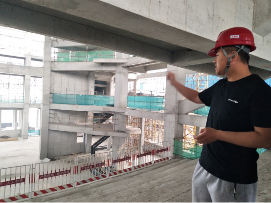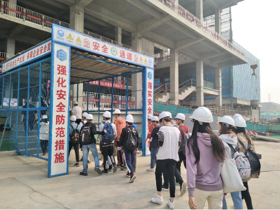 然后,项目负责人确认每位进入现场的人员戴好安全帽确保安全,带领大家进入施工场地。