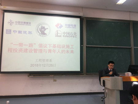 2018年12月25日上午10:00-12:00,中国交建海外事业部副总经理施颖陶先生,中国建筑海外事业部投资部副总经理蒋超先生,中国石化炼化工程集团国际项目风险管理负责人金峰先生,中国电建海外事业部战略规划处副处长马峰先生受公司工程管理系教师邀请,在沙河校区西区102与管理科学与工程2018级全体同学开展精彩对话活动,活动由李玉龙副教授主持,公司经理李文斌教授也出席了此次活动。