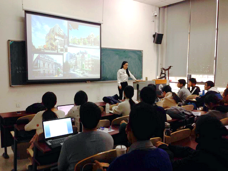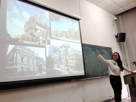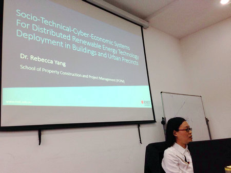 杨静博士首先对墨尔本皇家理工大学房地产,建筑和项目管理系以及她在墨尔本皇家理工大学的研究团队的成员和研究方向进行了介绍,然后选取了目前团队主要的研究项目:Socio-Technical-Cyber-Economic Systems For Distributed Renewable Energy Technology Deployment in Buildings and Urban Precincts 与大家进行了交流。分析了几种不同形式的光伏板放置方式和利用光伏材料作为建筑材料在城市中分布式发电的经济效益以及影响光伏发电经济效益的因素,展示了他们的模拟成果,介绍了他们的研究方法和技术,引起了大家的广泛讨论。在项目介绍完毕后,研究生们纷纷向杨静博士请教了各自感兴趣的问题,老师们也结合自己的研究提出了一些新的见解,在研究内容和研究方法上进行了深入的探讨。另外,杨静博士还对她的员工的研究项目进行了简单的介绍,为在座的研究生们提供了更多的研究思路。