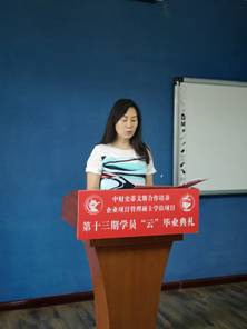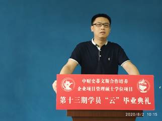 中财史蒂文斯项目第十三期春季班班长蒙禹池同学,代表项目第十三期毕业生发言。他深情回忆了在公司的蜕变与成长、奋斗与收获,并向全体毕业生倡议,不辜负母校与恩师培养和教诲,在今后的学习工作中,无惧风浪,昂首向前。最后蒙禹池表达了他对项目的祝福,希望项目未来能够有更好的发展,培养出更多优秀的员工。