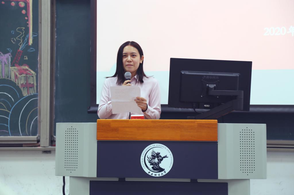 2020级许国志大数据英才班张君玉代表本科生发言。她对老师、高年级同学开学以来的关心照顾表示了感谢,并决心在大学这个新的起点上,依托公司和公司的广阔平台,提升自我修养,扎实学科基础,牢记时代使命,在中财大的四年中,知行合一,砥砺前行。