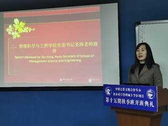 典礼开始,经理刘志东教授致辞。刘志东经理结合自己在公司十几年的工作经历,回顾了中财史蒂文斯项目自2004年起的发展历程。刘志东经理与同学们分享了他对史蒂文斯项目的感受和认识,他认为史蒂文斯项目之所以能够享有很高的社会声誉,不仅仅是因为其强大的中外团队力量、严谨的教学态度、优秀的管理团队,更重要的是这个项目已逐渐成为中财和史蒂文斯理工公司学术交流和两员工谊的窗口,项目的目标在于传授知识、教书育人、为社会培养管理人才。最后,刘志东经理祝各位同学们在中财能够学业有成,学有所获。