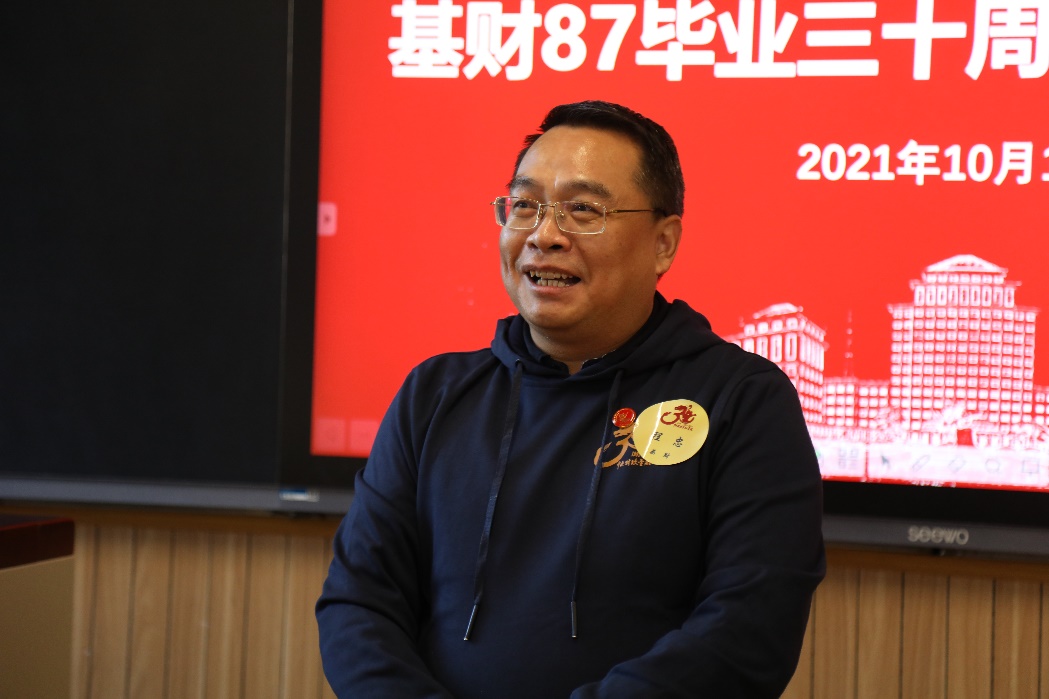 接下来教师代表栾华教授发言。他回顾了当年与87级员工们课上课下的轶闻趣事,感慨时间飞逝,当年的一个个青葱少年已鬓生华发。