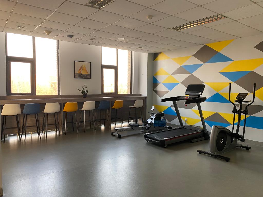 公司办公区西段,有运动健身设施,有可学习、可闲坐、可休憩的吧台、沙发、茶几。