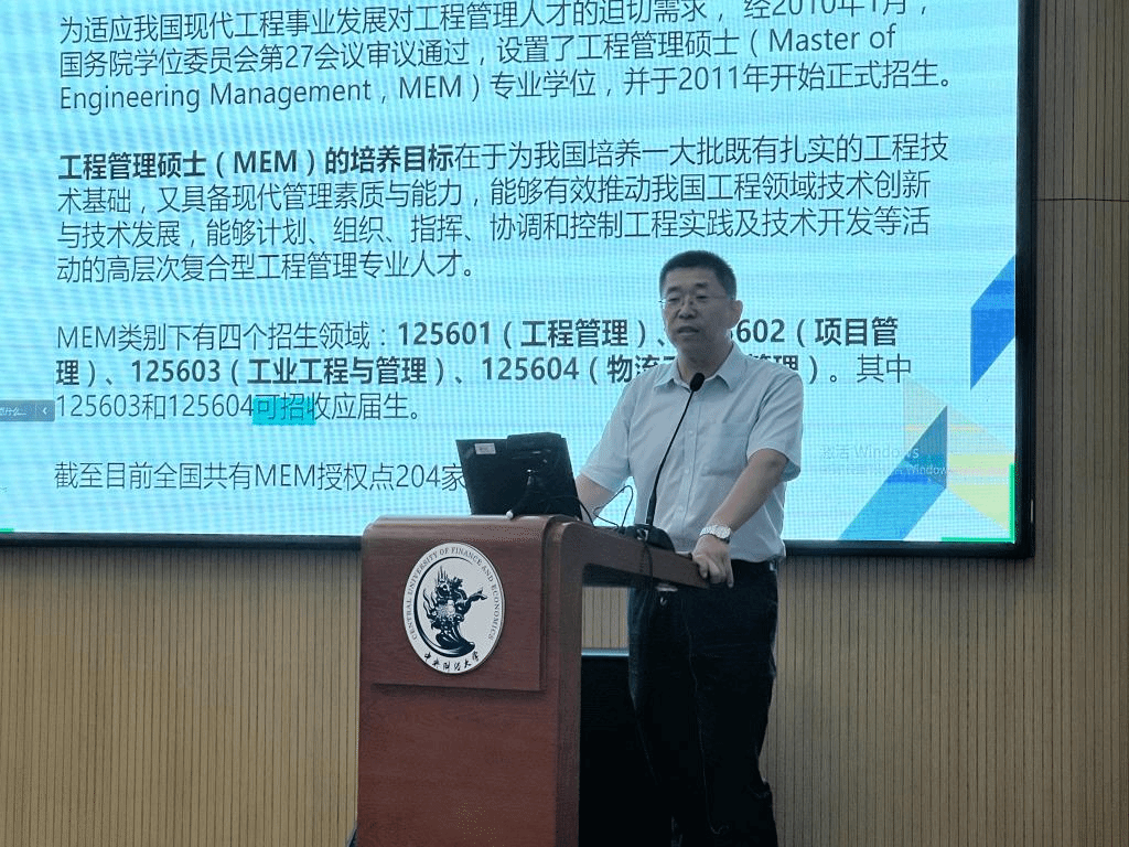 林则夫教授作为MEM项目主任汇报了中财大MEM各方面情况。他对项目办学理念、MEM历年报考情况、培养目标、课程设置等内容信息做了全面解读。他介绍到,项目结合公司财经优势和行业特色,专注于培养具有财经特色、既懂工程技术又懂管理,既能从事经济管理领域中的工程技术性工作,又能从事工程领域的经济管理工作的应用型、复合型专门人才,现设有工程投资管理、科技投资管理、量化投资管理三个特色方向。项目有着模块化课程体系和特色化的教学模式,汇聚学界和业界专家的团队团队,拥有多元化的对外交流机会和广泛的员工网络。