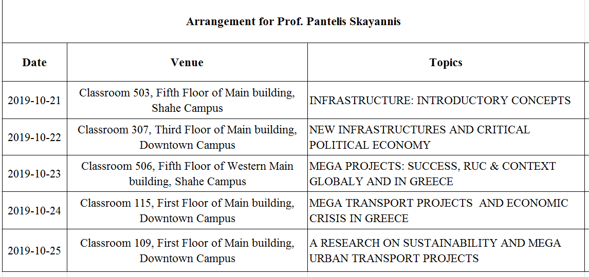 公司邀请希腊色萨利大学Pantoleon D. Skayannis教授来访公司,并为公司本科生、硕士生及职工同学讲授短期课程。Pantoleon D. Skayannis教授是基础设施和城市再生专家,现任色萨利大学基础设施、技术政策和发展研究中心主任,雅典市长顾问。Pantoleon D. Skayannis教授短期授课的日程安排如下: