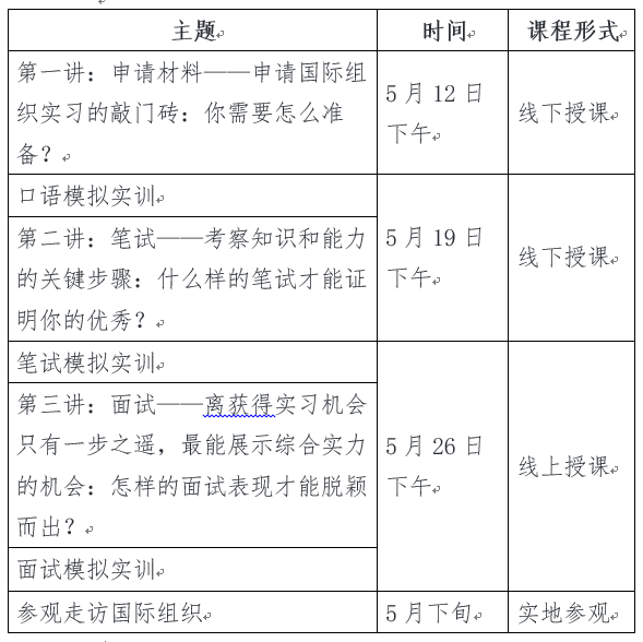 邀请国际组织任职经历丰富的专家授课,采用线上线下相结合的方式,以全球治理人才素质能力胜任力模型及能力要求为基础,围绕国际组织实习任职的申请准备、笔试及面试考察重点及注意事项等,全流程全要素开展国际组织招聘模拟和培训,并组织学员参访国际组织。