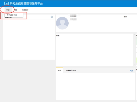 网上申请操作:为推动研究生教育管理信息化工作的进展,本次硕士生指导教师遴选工作将同步进行网上申请。校内申请人须登录研究生院“研究生信息管理与服务平台”(网址:http://10.13.62.66/yjsxt/),或在校园门户登录后选择进入“(新)研究生系统”,在“申请\导团队格申请”栏目中提交导团队格申请,图示如下: