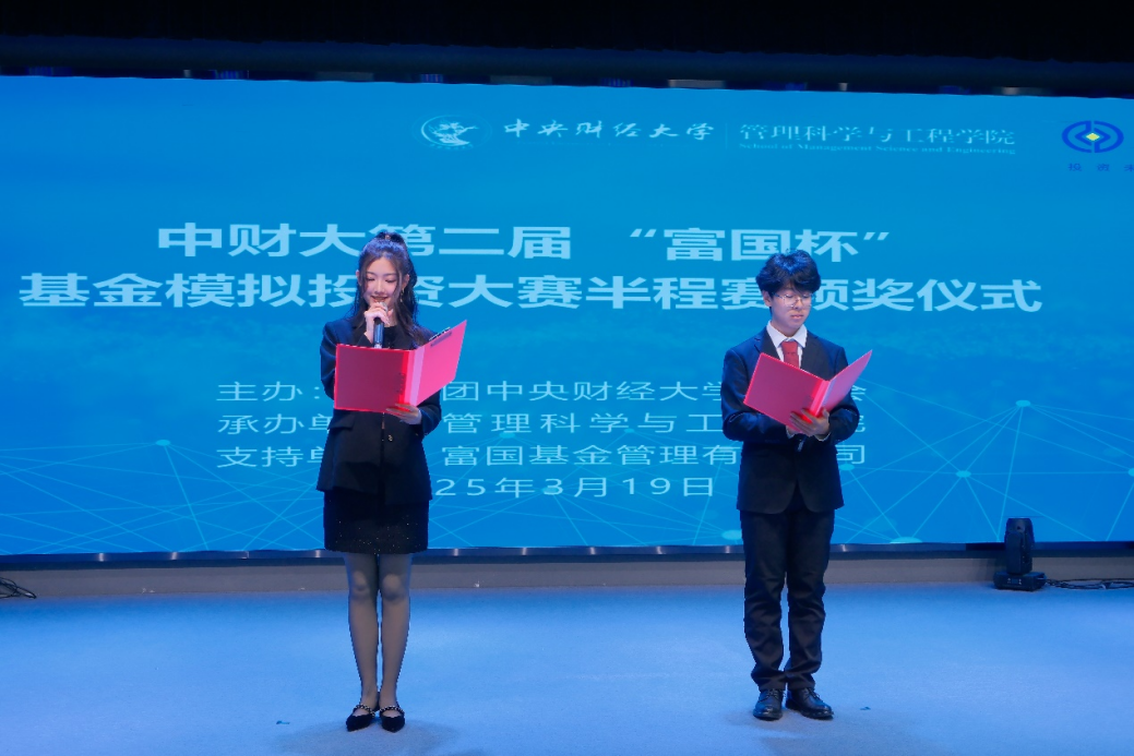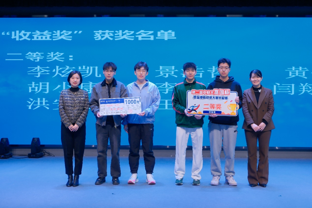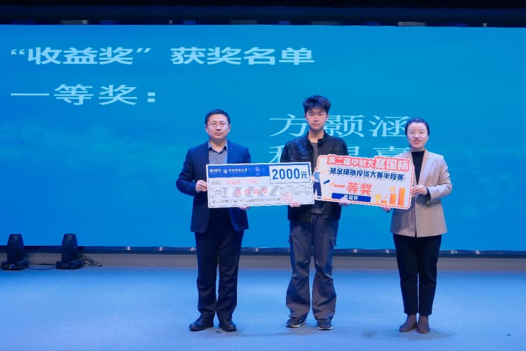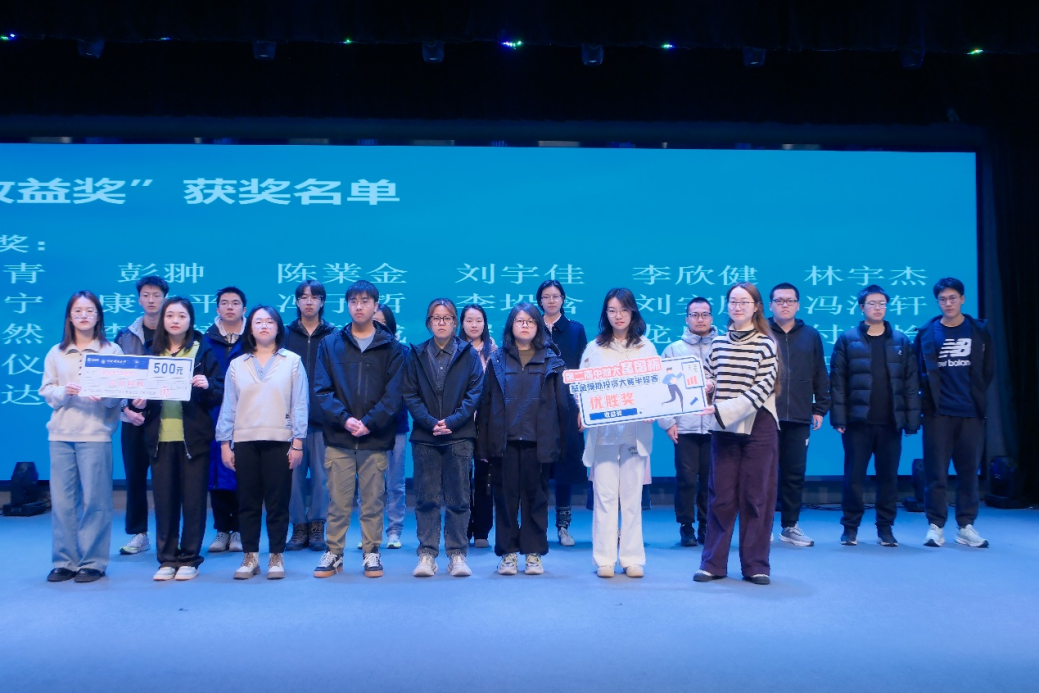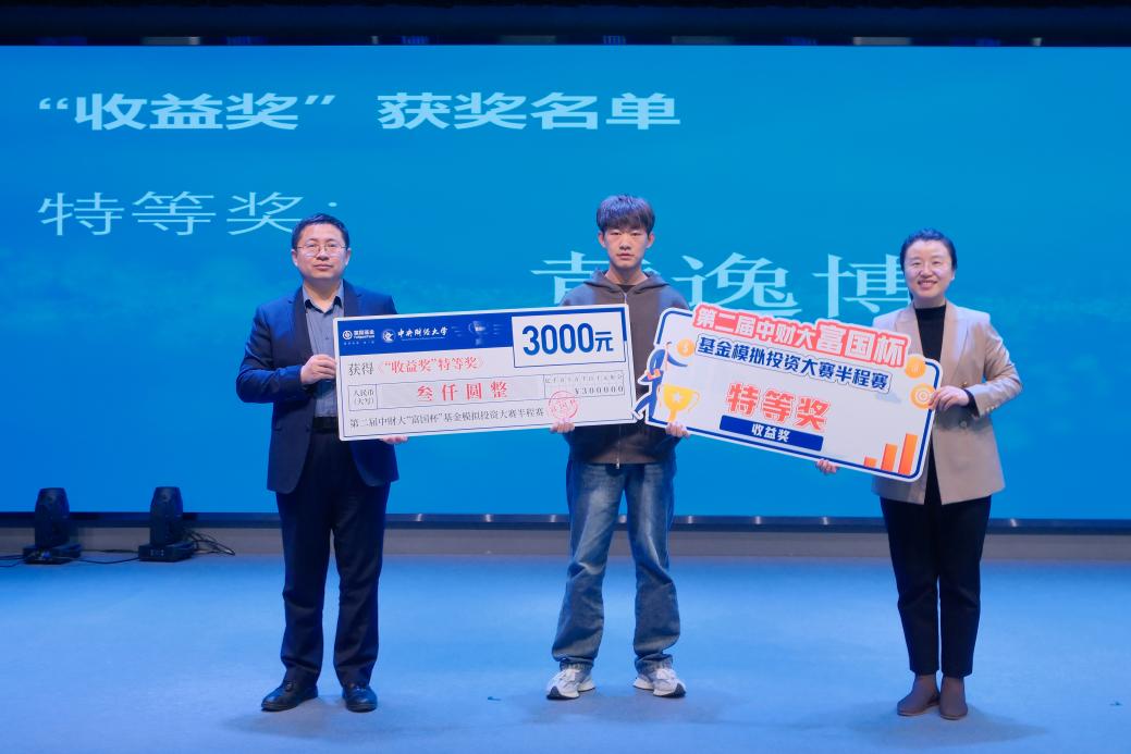 颁奖环节中,主持人宣读了中财大第二届“富国杯”基金模拟投资大赛半程赛“收益奖”获奖选手名单,由嘉宾依次为获奖同学颁奖,并与获奖同学合影留念。