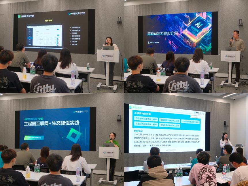 上午9点30分,青矩技术股份有限公司总裁办公室主任、青矩科技研究院副经理王渊博对公司师生的到来表示热烈欢迎,人力资源部经理张丽亚为大家详细介绍了关于我们,樊妍妍、高显悦、杜天祥从现代化工程咨询探索、工程圈互联网+生态建设实践、在AI方面的探索等角度出发,为同学们带来一场丰富的知识盛宴,不仅让同学们对行业发展趋势有了更清晰的认知,也深刻感受到科技创新为传统行业带来的变革力量。