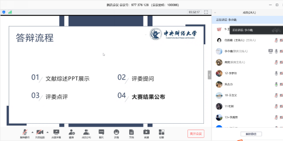 4月29日,以线上会议的方式完成了终审答辩。公司林则夫老师、李国平老师、戴学珍老师、周鹏老师和魏璐老师作为评委参与了答辩。线上答辩共分为四个环节:各组展示、评委提问、评委点评和大赛结果公布。首先,由各组参赛选手根据事先决定的顺序,进行限时7分钟的现场展示,然后由评审老师针对文献综述和展示环节内容进行提问,参赛选手逐一进行答辩,评审老师依据评审细则对各组论文进行打分。答辩环节,评审老师们从文献综述的内容、格式规范、引用文献的科学与代表性、全面性以及研究问题的前沿性与重要性等方面与选手进行了深入细致的交流,并对文献综述的写作提出了专业的意见和建议。