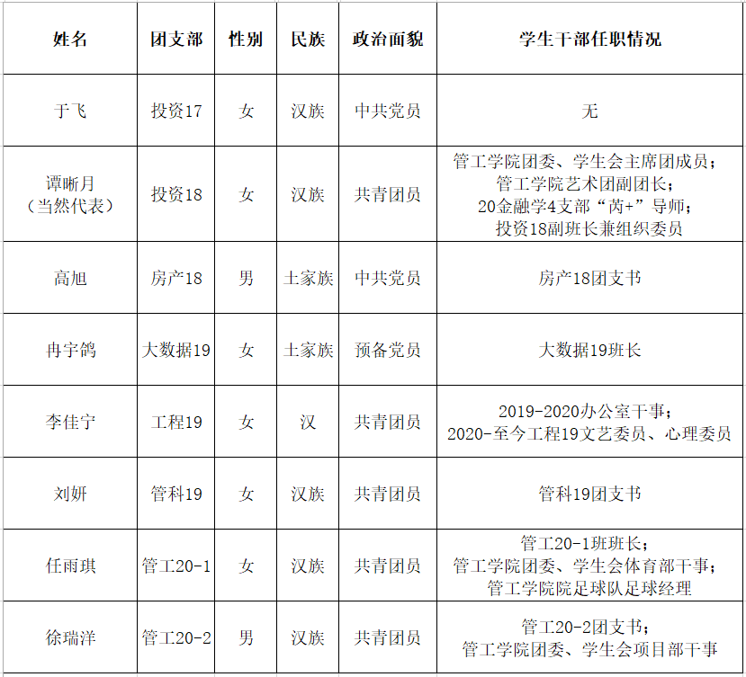 beet365于2021年4月20日——26日,组织开展了beet365第十三次员工代表大会、第二十七次研究生代表大会beet365代表推选工作。经过公开报名、班级推荐、民主酝酿、资格审查等程序,现决定推荐于飞等,共8位同学(含当然代表1位)作为第十三次员工代表大会代表,推荐贝佳丽共4位同学(含当然代表1位)作为第二十七次研究生代表大会代表。