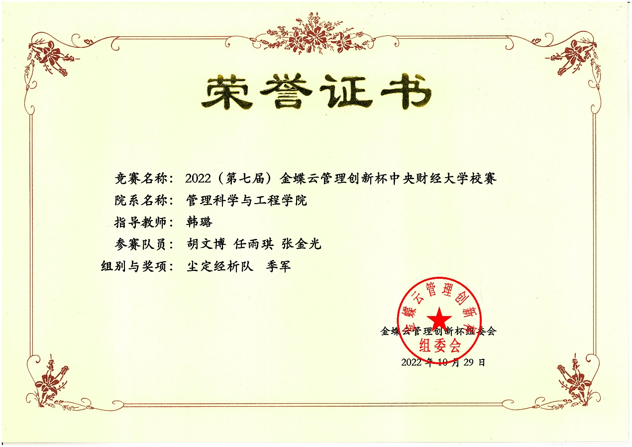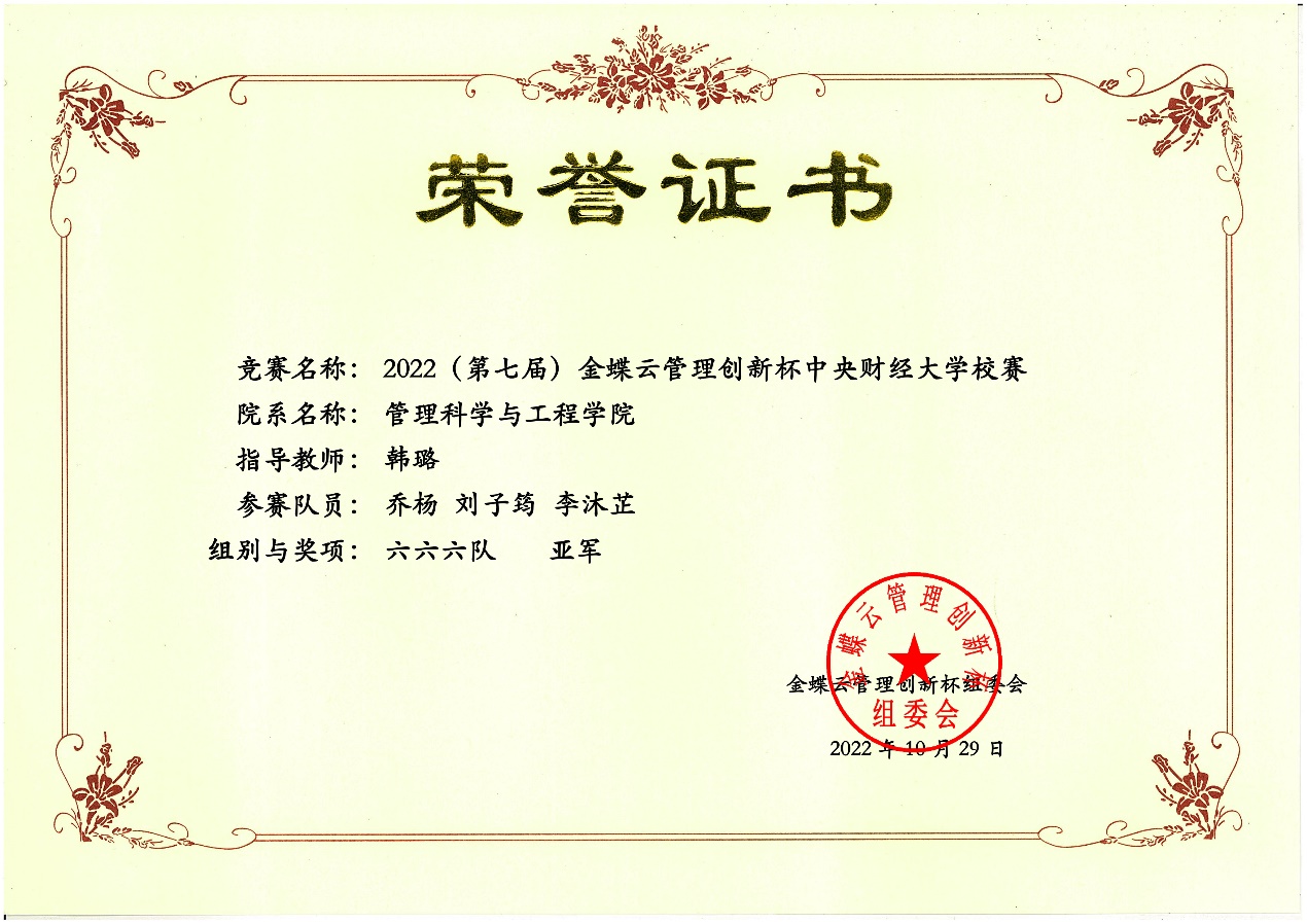 2022年10月29日上午9:00至12:00,“第七届金蝶云管理创新杯大赛”beet365校赛(以下简称校赛)成功举办。公司管理科学2020级本科生刘柏江、周钰、赵一舟以团队97分的评分摘得桂冠,管理科学2020级本科生乔杨、刘子筠、会计2021级本科生李沐芷以团队92分的评分获得亚军,管理科学2020级本科生胡文博、任雨琪、张金光以团队91.5分的评分获得季军,三支队伍代表公司成功晋级区域赛。