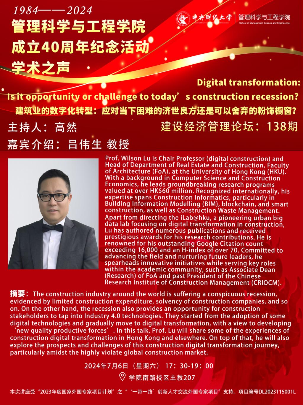 讲座题目:Digital transformation: Is it opportunity or challenge to today’s construction recession?建筑业的数字化转型:应对当下困难的济世良方还是可以舍弃的粉饰橱窗?
