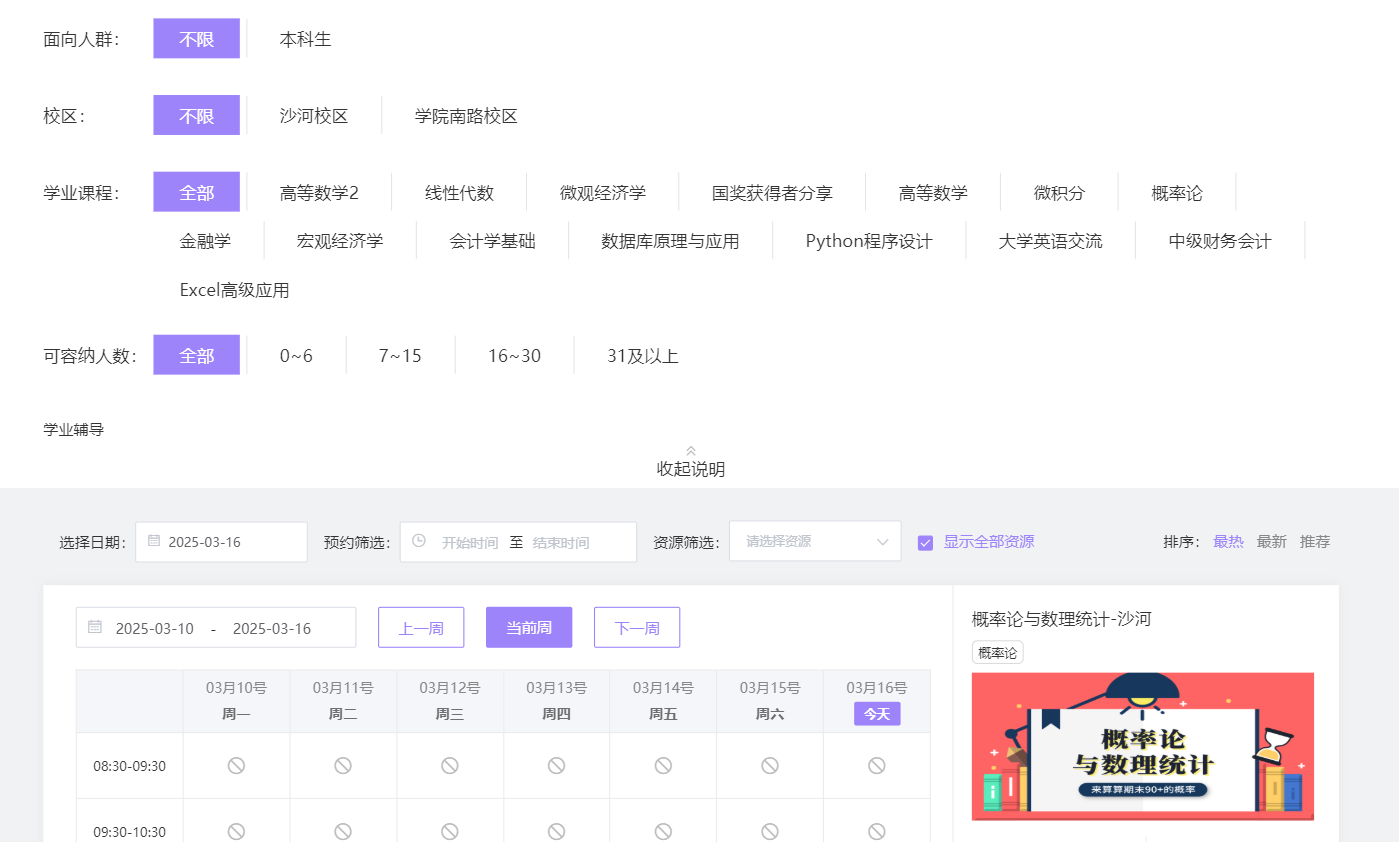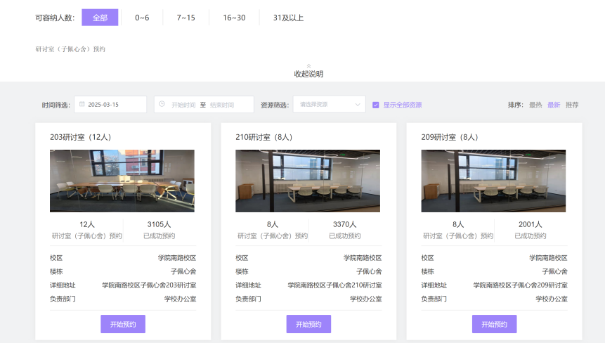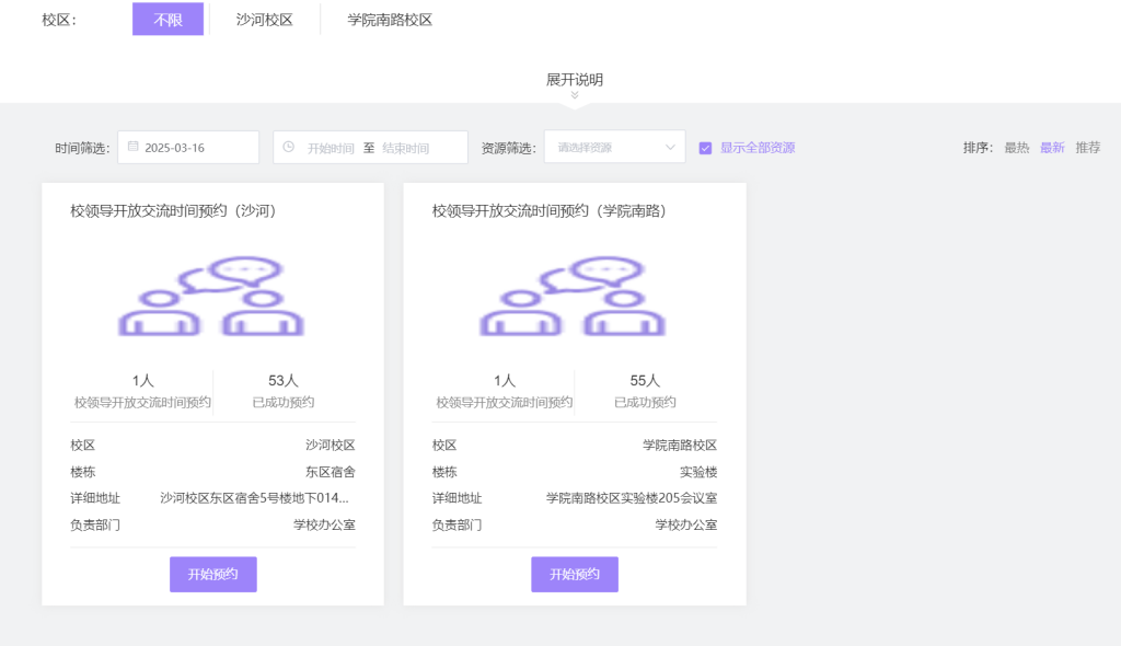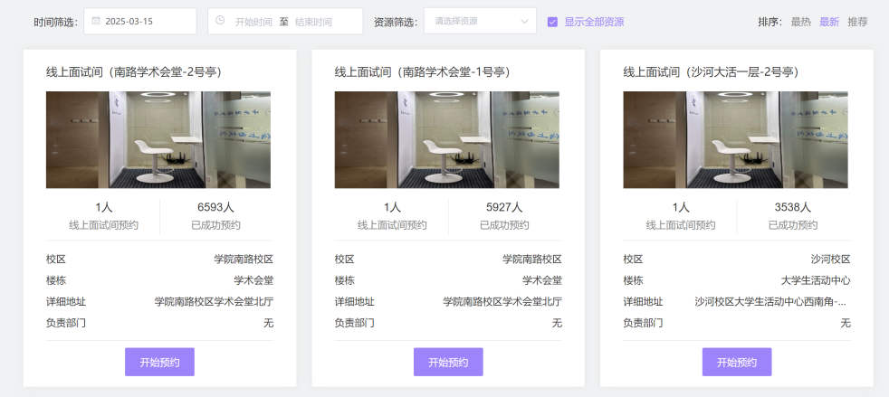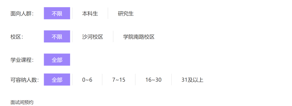 该服务主要应用于公司沙河、公司南路两个校区的面试间申请。点击平台相关栏即可进入预约页面,可以对以下条件进行筛选: